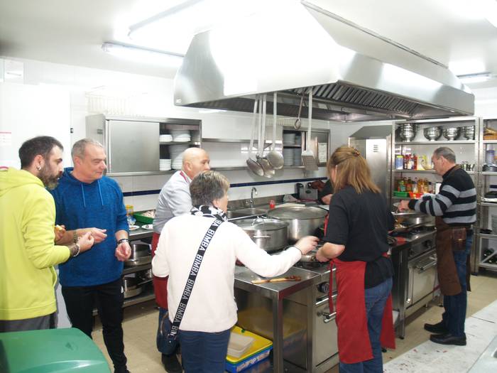 Ordura arte lanean zeuden guztiak elkarteko barrara hurbildu ziren, aldameneko sukaldetik frijitutako txerriki, urdai frijitu eta saltxitxoi frijitu kazolatxoak ateratzen hasi baitziren. Hamaiketako ederraren ondoren, txorizoak eta saltxitxoiak egiten hasi ziren. Gallardok azaldu zuenez, neurria hartuta diote eta urtero 36na txorizo eta saltxitxoi egiten dituzte. Bakoitzerako dozena bat kilo txerriki erabiltzen dute.