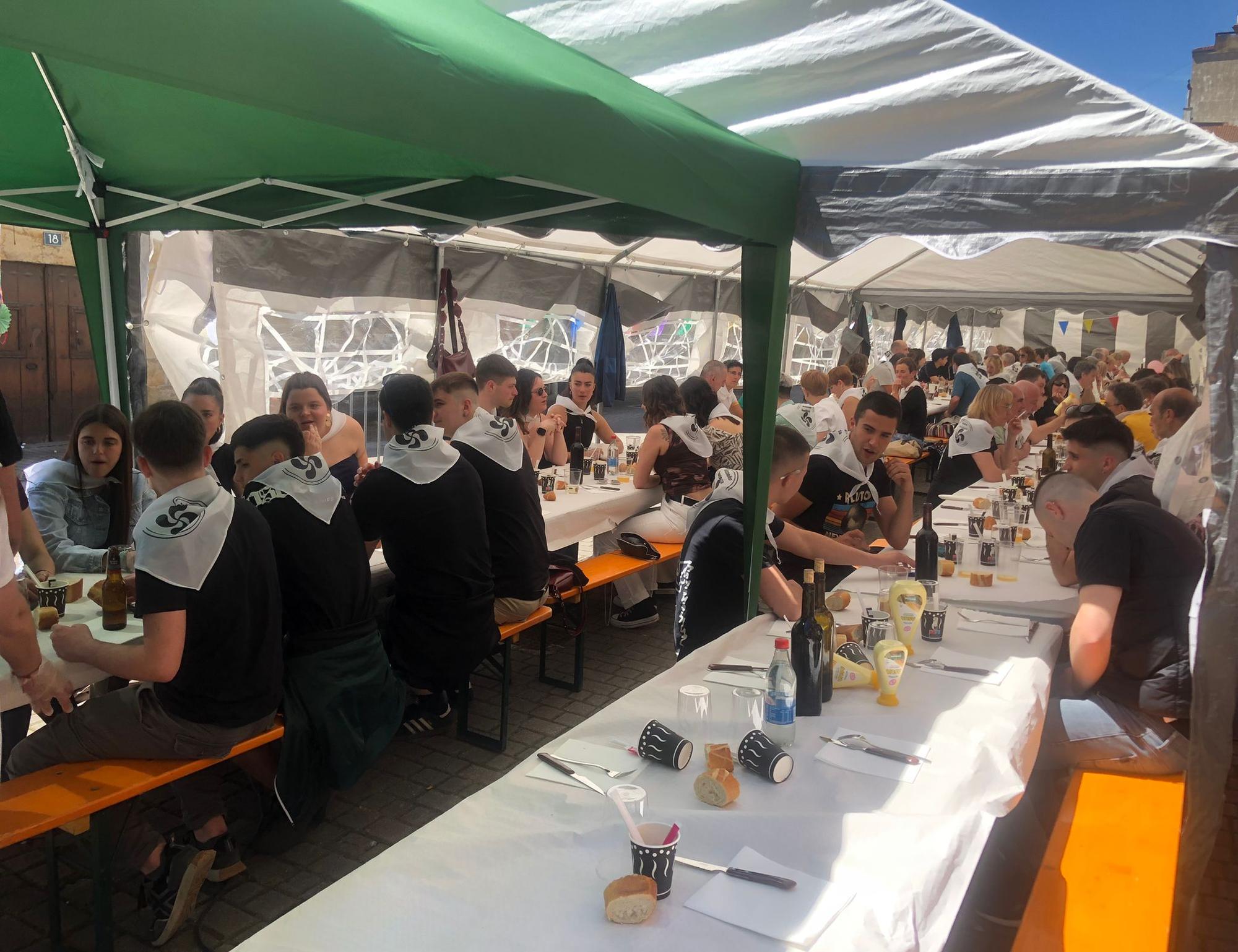 Lehenengo urtean mahaiak jarri genituen eta bero handia egin zuen, eta denak erre ginen. Hasieratik zikiroa egin dugu; zikirorik gabe ez dago bazkaririk. Bigarren urtean, euri zaparrada egin zuen, eta toldoak ahal izan genuen bezala jarri behar izan genituen. Horregatik, bi karpa erosi genituen bildutako diruarekin. Bestela, berdin jarraitzen dugu.