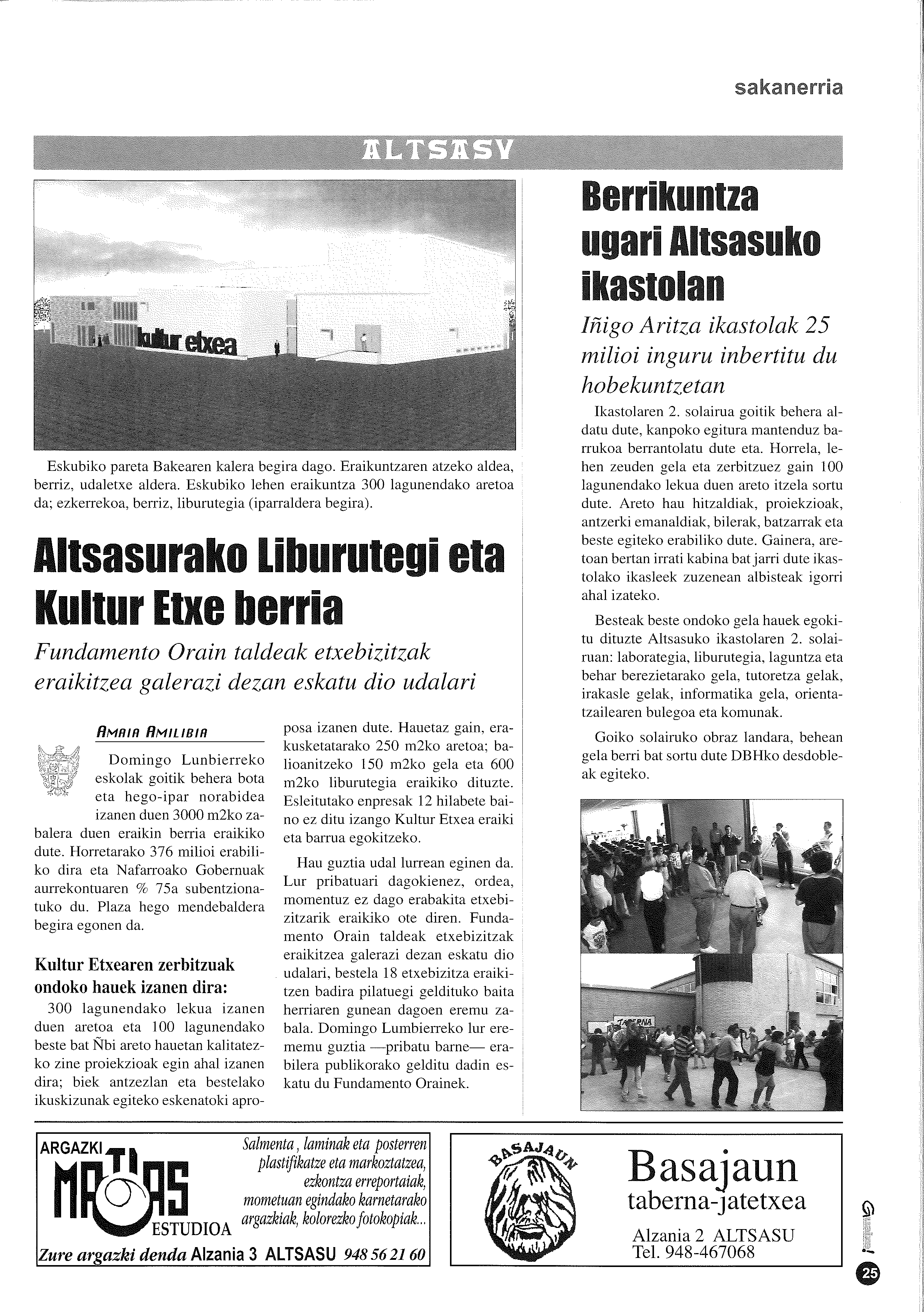Domingo Lumbier eskolen eraikina bota ondoren lur publikoetan eraikiko zen kultur etxearen proiektua zehaztu zuten. 3.000 m2-ko azaleran kultur gunea eta liburutegia eraikiko ziren. Bi areto izanen zituen 100 eta 300 ikuslerendako tokia zutenak. Gainera, 250 m2-ko erakusketa gela, erabilera anitzeko 150 m2-ko gela eta 600 m2-ko liburutegia izanen zituen kulturari eskainitako espazioak. 376 milioi pezetako (2.259.760 euro) aurrekontua zuen.