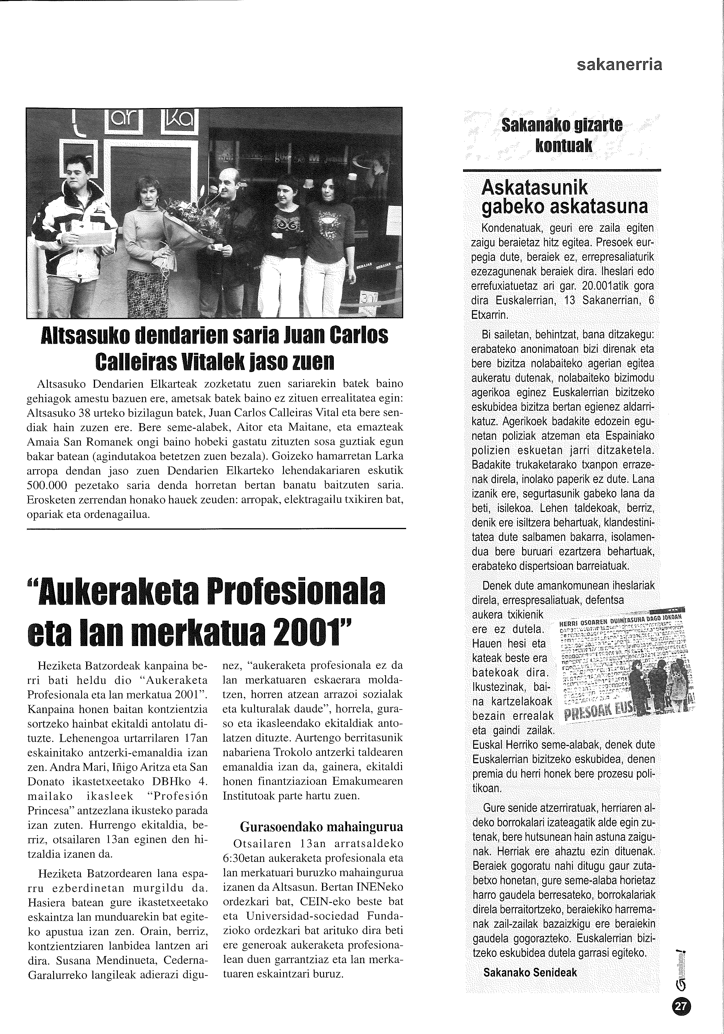 Altsasuko Dendarien Elkarteak bere bezeroen artean 500.000 pezetako (3.005 euro) saria zozketatu zuen. Dirua elkarteko dendetan gastatu beharra zegoen egun bakarrean. Larka dendan banatu zen txartel irabazlea eta hura Juan Carlos Calleiras Vitalek eskuratu zuen. Familiakoekin batera saria 10:00etan jaso zuen. Erosketa zerrendan zituzten arropak, etxe tresna elektriko txikiak, opariak eta ordenagailua.