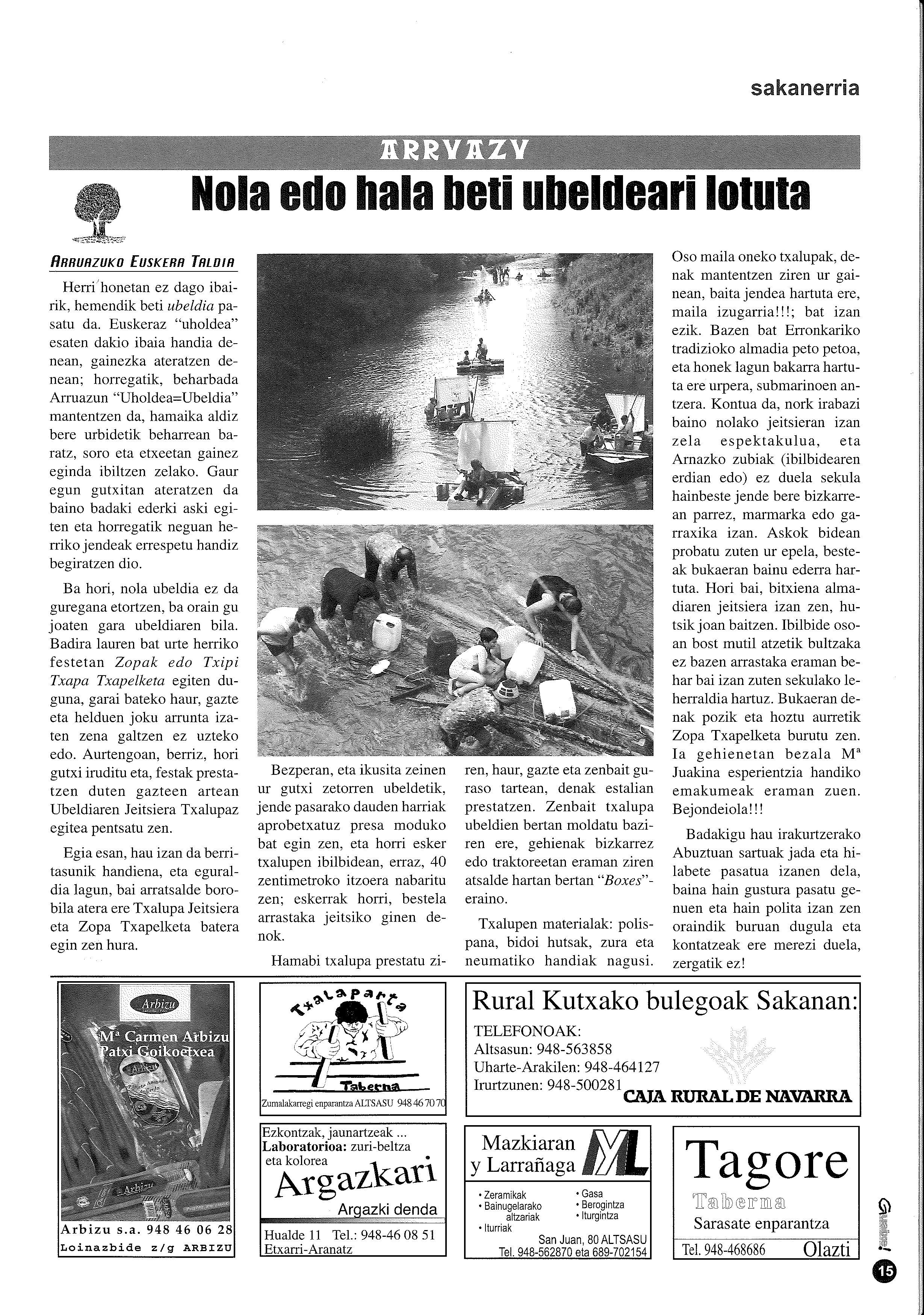Arruazuko festetan zopa edo txipi-txapa txapelketa jokatu zen ubeldean. Lau bat urte ziren jokatzen zena, eta adin guztietako arbazuarrek parte hartu zuten. Maria Joakina izan zen atzera ere irabazlea. Festetan, estreinakoz, Ubeldiaren Jeitsiera Txalupaz ospatu zen. Denetariko materialekin egindako dozena bat txalupek parte hartu zuten eta ikuskizun ederra eman zuten. Ur maila oso baxua zenez, txalupak ibiltzeko jendearen pasarako harrietan uharka modukoa egin behar izan zuten.