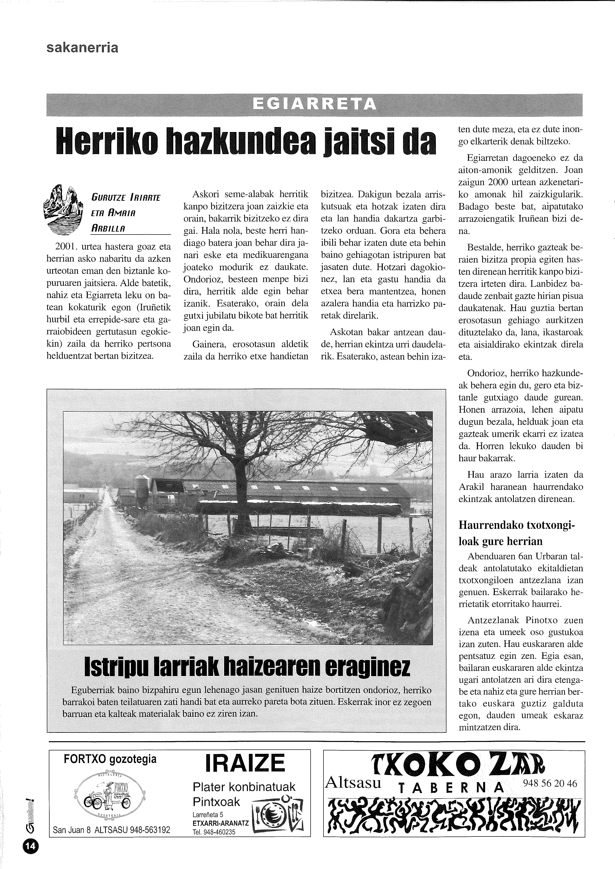 Aurreko urteetatik zegoen joera 2000. urtean segida izan zuen eta biztanleria galdu zuen Egiarretak. Eta herrian ez zen adineko pertsonarik bizitzen, 2.000 urtean azkenak hil baitziren. Zaila zen haiek herrian gelditzea. Batetik, seme-alabak kanpora bizitzera joan zitzaizkielako, bestetik, erosketak egitera edo medikura Egiarretatik kanpo joan behar zutelako eta, azkenik, herriko etxe handiek erosotasun gutxi eskaintzen zizkietelako. Gazteak bizi proiektua hirian egiten ari ziren.