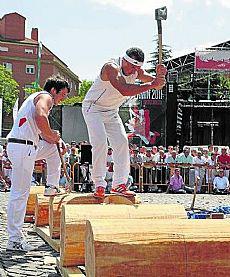 Nafarroako Binakako Aizkora Txapelketa1.Floren Nazabal-Jon Rekondo: 22:302.Juanjo Lopez-Antonio Senosiain: 22:413.Donato Larretxea-Oihan Larretxea: 23:15Sanferminetako herri kirol egitarauaren barruan, Iruñeko Foru Plazak Nafarroako Binakako Aizkora Txapelketa hartu zuen igandean. Ikusle ugari bildu ziren plazan, hiru bikok jokoan zuten txapela nork jantziko zuen ikustera. Floren Nazabalek Jon Rekondorekin osatu zuen bikoa, Juanjo Lopez Azpilikuetak Antonio Senosiainekin eta Donato Larretxeak bere seme Oihan Larretxearekin. Biko bakoitzak 12 enbor erdibitu behar izan zituen, 6 kanerdiko eta 6 60 ontzako. Finala ikusgarria izan zen, oso polita, azken unera arte oso lehiatua izan zelako. Larretxeatarrak izan ziren aurreratu zirenak, abantaila atereaz, baina Floren Nazabalek eta Jon Rekondok euren indarrak hobeto neurritu zituzten eta lan erdietan denbora onena egin zuten. Hortik aurrera larretxeatarrek behera egin zuten eta Lopez eta Senosiainekin oso berdinduta egon arren, azkenean beratarrak hirugarrenak izan ziren. Hiru bikoen aldean ez zen alde handirik izan. Nazabalek eta Rekondok 11 segundoko aldea atera zioten Lopez eta Senosiaini, eta 45 segundoko aldea larretxeatarrei. Oiarbideren erakustaldiaJaialdi berberean 18 urteko Aitor Oiarbide harri jasotzaile etxarriarrak erakustaldia egin zuen. 100 kiloko eta 140 kiloko harriekin aritu zen etxarriarra. 100 kiloko harriarekin arituz guztira 1100 kilo jaso zituen minutu batean, 11 altxaldi eginez. 140 kilokoarekin, aldiz, 560 kilo jaso zituen bi minututan.