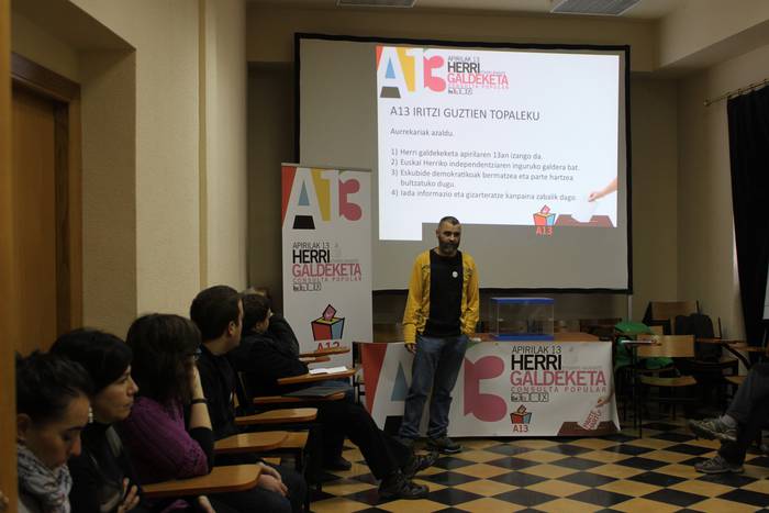 Apirilak 13 (A13) herri ekimenak bigarren herri batzarra deitu du heldu den ostegunerako. Ekimenari izena ematen dion datarako independentziari buruzko herri galdeketa antolatzen ari dira eta sustatzaileek erabakiak herri batzarretan hartzea erabaki zuten. Aurreneko batzarrean galdeketaz azalpenak ematearekin batera, etxarriarrei luzatuko zaien galdera erabaki zuten: Nahi duzu Euskal Herri independente bateko herritarra izan?