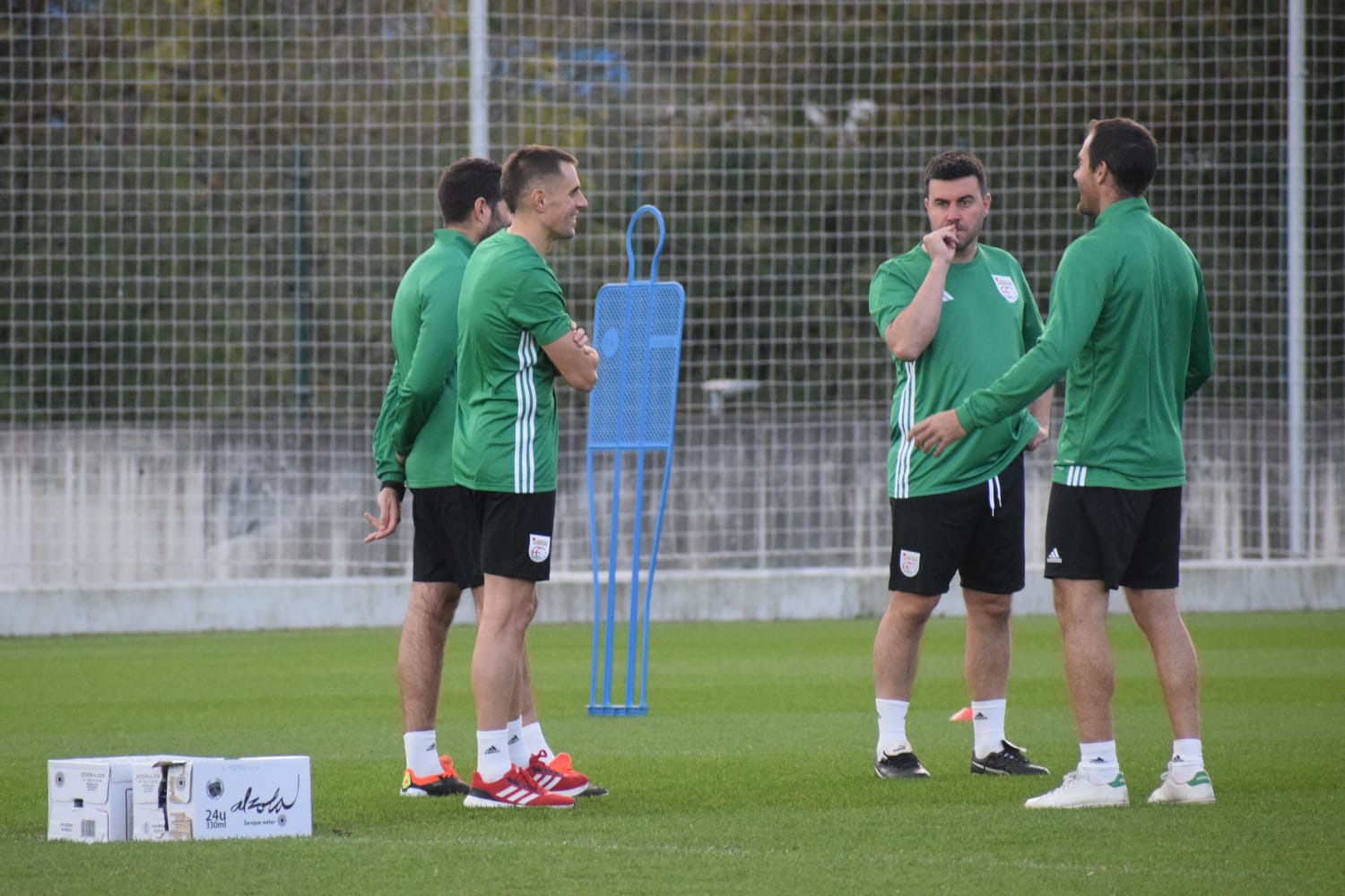 Gehienek elkar ezagutzen genuen ligan edo kopan aurka jokatzen dugulako edo aurreko deialdietatik. Egia da deialdi honetan hamazazpi jokalari berriak zirela; gutxi batzuk errepikatzen zuten. Dena den, jokalariak, staffeko kideak bezala, hala nahi dutelako daude selekzioan, gogotsu daude eta giroa oso ona da. Ez dago ligako partida batean dagoen tentsio puntu hori, alde horretatik lasaiagoa da. Selekziora doan jendeak badaki zertara joaten den, eta giroa berezia izaten da, Athletic, Alaves, Erreala edo Elcheko jokalariekin halakoetan egoten garelako bakarrik. Ligan beraien kontra jokatzen dugunean soilik unetxo bat egoten gara, 5 minutu eskas.
