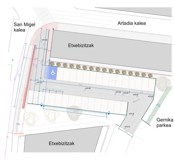 Aparkalekuak gaur egun dagoen %8ko malda izanen du eta han 33 autorendako tokia izanen da, haietako bat mugikortasun mugatua duten pertsonendako izanen da. Autoendako bidea porlanezkoa izanen da eta aparkamendu plazetan porlanezko saretak jarriko dituzte, tarteetan belarra hazten den horietakoa. San Migel kalean bi metro arteko altuera hartzen du partzelak. Lurrari eusteko aurrez fabrikatutako porlanezko piezak jarriko dira.