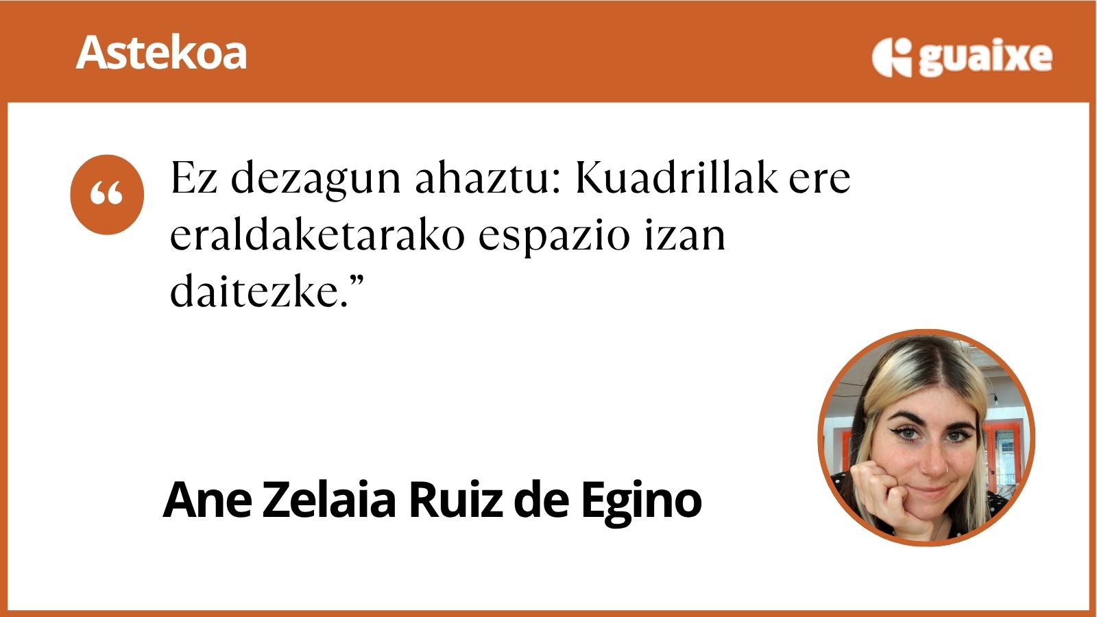 Azken batean, laguntasuna birplanteatzea ez da soilik ariketa pertsonala, ekintza politikoa ere bada. Laguntasuna hautua da: elkar entzun, elkar zaindu eta elkar errespetatzeko borondatez eraikitako espazioa. Ez dezagun ahaztu: kuadrillak ere eraldaketarako espazio izan daitezke.