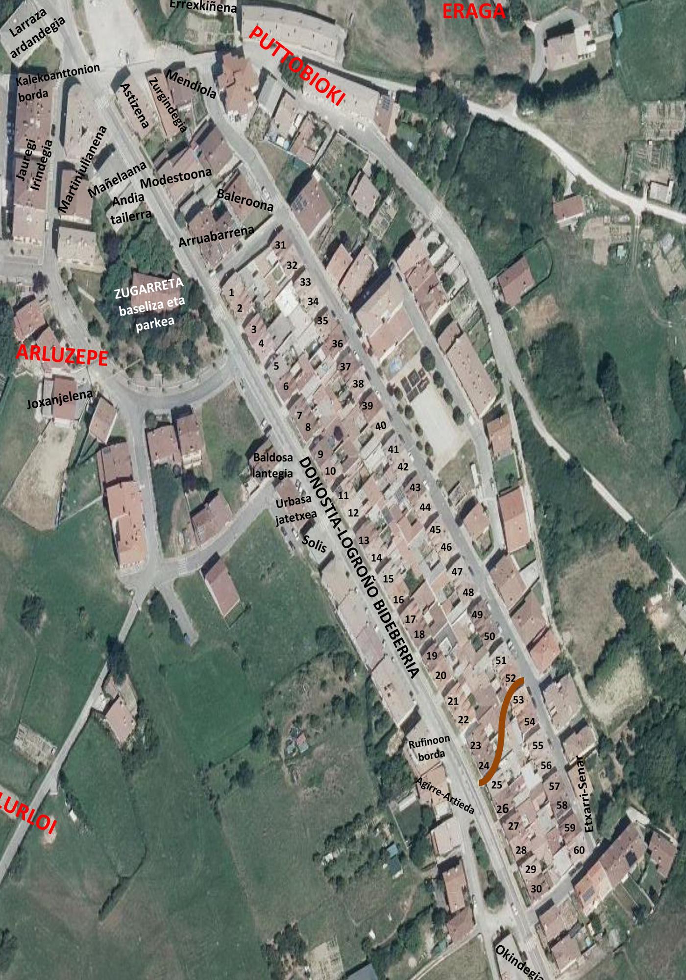 Etxarriko bidegurutzetik Lizarraga aldera doan bideberriaren ekialdeko baztarrean daude bi lerrotan eraikiak, Zugarretako baselizaren parean hasi eta garai bateko “panificadora” edo okindegiaren eraikuntza zaharreraino.