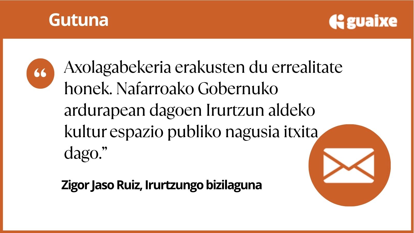 Ez da errekurtso hau tarte luze batez itxita ematen duen lehendabiziko aldia, eta liburutegiko erabiltzaile asko kezkaz, amorruz eta etsipenez bizi dugu egoera hau. Liburu, disko edota DVD mailegua eskaintzeaz harago, Irurtzungo Liburutegi Publikoak eskaintzen baitu lasaitasun giro batean ikasteko tokia, hilabete hotzenetan eman daitezkeen eguraldi makurreko egun horietan haurrekin egoteko espazioa… Kultur eta jatorri ezberdinetako pertsonen arteko elkargune era bada, eta baliabide ekonomiko urriko herritar askoren kulturarako sarbidea ere bermatzen du. Badakigu gutxienez Nafarroako beste dozena erdi herritan eta antzeko arrazoiengatik beste zenbait liburutegi publiko itxita daudela, hortaz, Irurtzungoa ez da kasu bakarra. Axolagabekeria erakusten du errealitate honek. Nafarroako Gobernuko ardurapean dagoen Irurtzun aldeko kultur espazio publiko nagusia itxita dago eta horrela jarraituko du beste zenbait astez dagokionak neurririk hartzen ez badu. Kultura, Kirola eta Turismo sailak, alde batetik, eta Funtzio Publikoko Zuzendaritza Nagusia, bestetik, dira langilea lehendabiziko egunetik ordezkatu eta denok ordaintzen dugun errekurtsoaren zabaltzea bermatu behar dutenak. Ezagutzara dugun eskubidea ezin du kontratazio zerrendak kudeatzeko modu eskas batek baldintzatua izan, eta errekurtsoaren irekiera bermatu behar duten horiei exijitu nahi diegu modu urgente batean zabal dezatela berriro gure herriko liburutegi publikoa. Ez gara besoak gurutzatuta egongo.