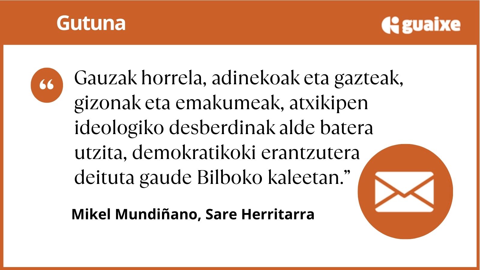 Gauzak horrela, adinekoak eta gazteak, gizonak eta emakumeak, atxikipen ideologiko desberdinak alde batera utzita, demokratikoki erantzutera deituta gaude Bilboko kaleetan, urtarrilaren 10ean; izan ere, guztion ahalegin partekatuak bakarrik lagunduko digu giza eskubideetan oinarritutako bizikidetza lortzen.