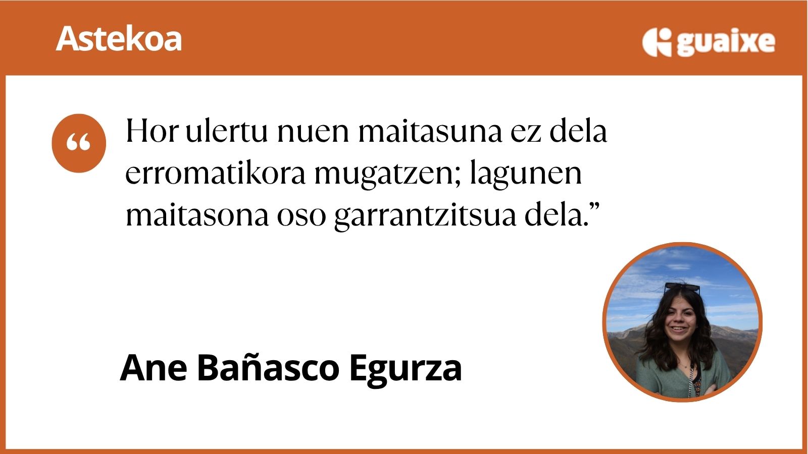 Galderak ez dira sinpleak: biluztera behartzen zaituzte, beldurrak, oroitzapenak eta desioak partekatzera, askotan adierazten ez direnak, ezta sakonki ezagutzen dituzunekin ere. Hor ulertu nuen maitasuna ez dela erromantikora mugatzen. Lagunen maitasuna oso garrantzitsua dela, sostengatzen zaituena, eta maitatua eta lagundua sentiarazten zaituena.