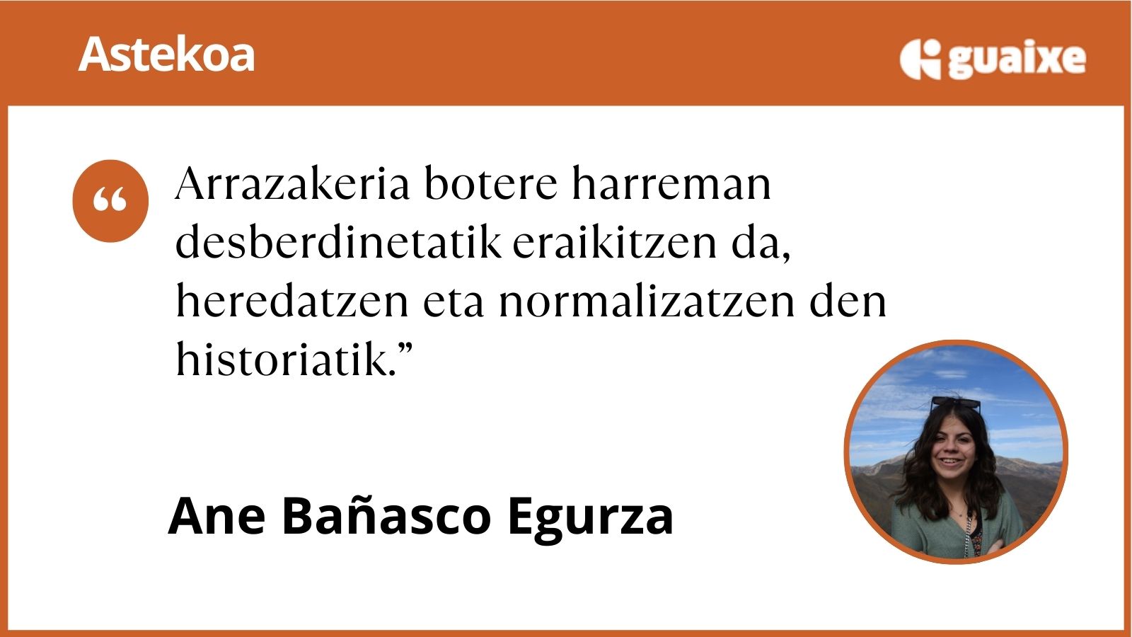 Kezkagarriena da asmo onetik ere errepika daitekeela. Entzun gabe laguntzen dugunean, beste batzuekin hitz egin beharrean beste batzuen ordez hitz egiten dugunean, edo pertsona bat bere beharretara murrizten dugunean, logika arrazista elikatzen jarraitzen dugu. Arrazakeriari aurre egitea ez da hori salatzea bakarrik, geure burua eta arrazakeriari eusten dioten egiturak zalantzan jartzea baizik.