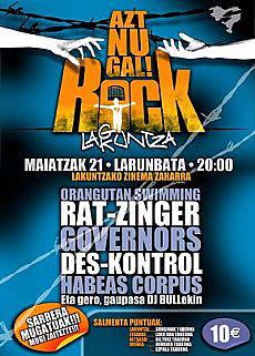 Bihar iluntzean elkartasun jaialdia hartuko du Lakuntzako zinema zaharrak. Bost talde igoko dira eszenatokira: Etxarri Aranazko Orangutan Swimming, Bizkaiko Rat-zinger, Gipuzkoako Governors eta Des-kontrol eta Madrilgo Habeas Corpus. DJ Bullek agurtuko du elkartasun festa."AZTNUGAL" idatzi zuen Patxi Arratibel Xafanek, tortura saio gogorraren ondoren, laguntza eske. Aztnugal rock jaialdia antzeko egoera jasan dituzten guztiendako elkartasun kontzertua da. Bertan biltzen direnen deiadarrak hesi guztiak gaindituko ditu.KontzertuaSakanako Orangutan Swimming taldeak emanen dio hasiera jaialdiari. Etxarriko taldea herriko lokalean sortu zen. Hain zuzen, lokalaren aldeko kontzertuan eman zuen lehenengo zuzenekoa, 2009an. Ondoren, ez dira gelditu. Gazte taldeak planteamendu irekia eta berritzailea egin du. Gitarra eta bateria indartsuak rap erritmo bizi eta zuzenekin tartekatzen dituzte, eta musika elektronikoari ere tartea egiten diote. Bizkaiko Rat-zinger taldeak emanen dio jarraipena kontzertuari. Eskarmentu handiko musikariek osatzen dute rock talde indartsua. Besteak beste, Anarko eta PiLTko kideek osatzen dute. Hadrcore eta metal doinuan jorratzen zituzten taldeetatik etorri arren, Rat-zingerrekoek rock and roll eta punk doinuak egiten dituzte. Aurten argitaratu dute taldearen lehen diskoa. Hura ezagutzeko aukera dugu Lakuntzan.Jarraian, Arrasateko bi talde igoko dira eszenatokira. Deba Goieneko hiria talde arrakastatsuen harrobi izan da azken urteetan. Horien artean daude Governors eta Des-kontrol. Governors taldea euskal rockaren historian urrezko hizkiekin idatzita dauden taldeen ondorengoa da. J. Sang abeslaria Ekon eta Fjord taldeetan egon da. Alde horretatik, argi dago rockarekiko apustua. Rock borrokalaria eta, aldi berean, baikor eta sortzailea egiten dute. Doinu melodikoko banda indartsuak ikuskizun bizia eskainiko du Lakuntzan. Keu taldekideak Beleixe irratian (FM 107.3) esan zuenez, "taldearen mezuak indar berezia hartuko du Aztnugal elkartasun jaialdian".Ondoren, Des-koltrol taldeak hartuko du txanda. Taldea 1994an sortu zen Arrasaten. 70eko hamarkadako punkaren eta 80ko eta 90eko oi! eta street-punkaren eragina dute. Urteen joan-etorriak aldaketak ekarri dizkio taldeari, baina bere izaerari eutsi dio. Euskal Herria, Espainia, Portugal, Europa eta AEBetara eraman dute haien musika. Bihar, Lakuntzako elkartasun kontzertuan izanen dira.Madrileko Habeas Corpus taldeak itxiko du elkartasun jaialdia. Aski ezaguna da madrildarren ibilbidea. 1994an lehen diskoa argitaratu zutenetik argi utzi zuten zabaldu nahi zuten mezua: faszismoaren eta sistemaren aurkako talde nekaezina da. Musika bortitza egiten dute, baina rap core edo hardcore-ari ere lekua egite diote eta lelo kantagarriak dituzte. Zuzenekoetan paregabeak dira. Bost musika talde bikainekin ase ez direnek, elkartasun gaua luzatzeko aukera izanen dute DJ Bull-ekin. TaldeakOrangutan Swimming, Rat-zinger, Habeas Corpus, Governors eta Des-kontrolSarrerak10 eurotan salgai, Lakuntzan (Sorginak), Etxarri Aranatzen (Leku Ona), Altsasun (Biltoki), Iruñean (Herriko taberna eta Ezpala) eta, egunean bertan, Lakuntzako zineman.