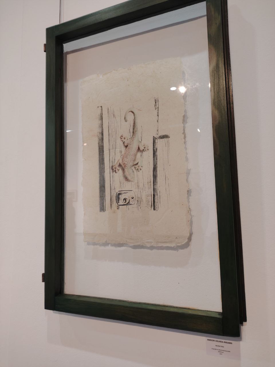 Diseinu grafikoa ikasi nuen, eta horren inguruko lan baten bila egon nintzen, eta ez nuen aurkitu. Niri betidanik gehiago gustatu izan zait eskuak zikindu eta gauzak eskuz egitea, eta diseinu grafikoa digitalagoa zen. Orduan, Iruñeko Arte Eskolan Grabatuaren eta estanpazio teknikak ikasketak egitera sartu nintzen. Hor bai. Bi urte egon naiz Arte Eskolan, eta erakusketan jarritako lanak Arte Eskolan egindako lanak dira, ikasi dudan guztia lanetan islatuta.