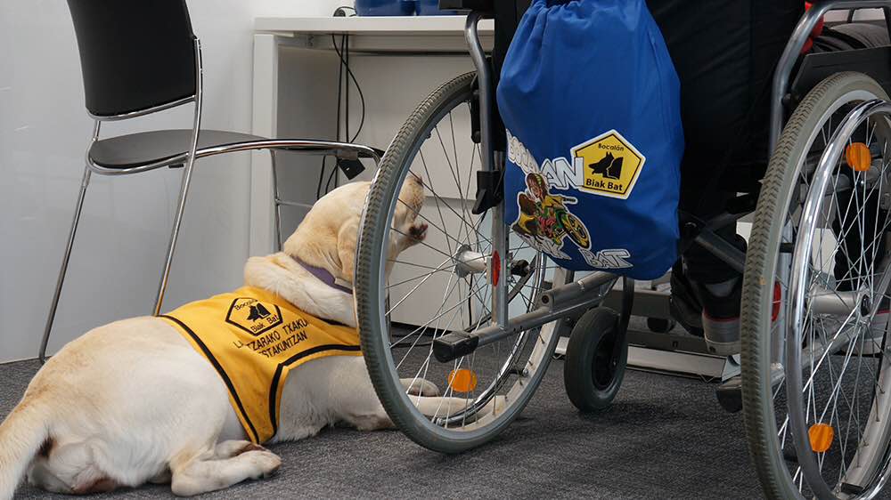 Bocalan-laguntza txakurra gurpildun aulkiaren ondo
