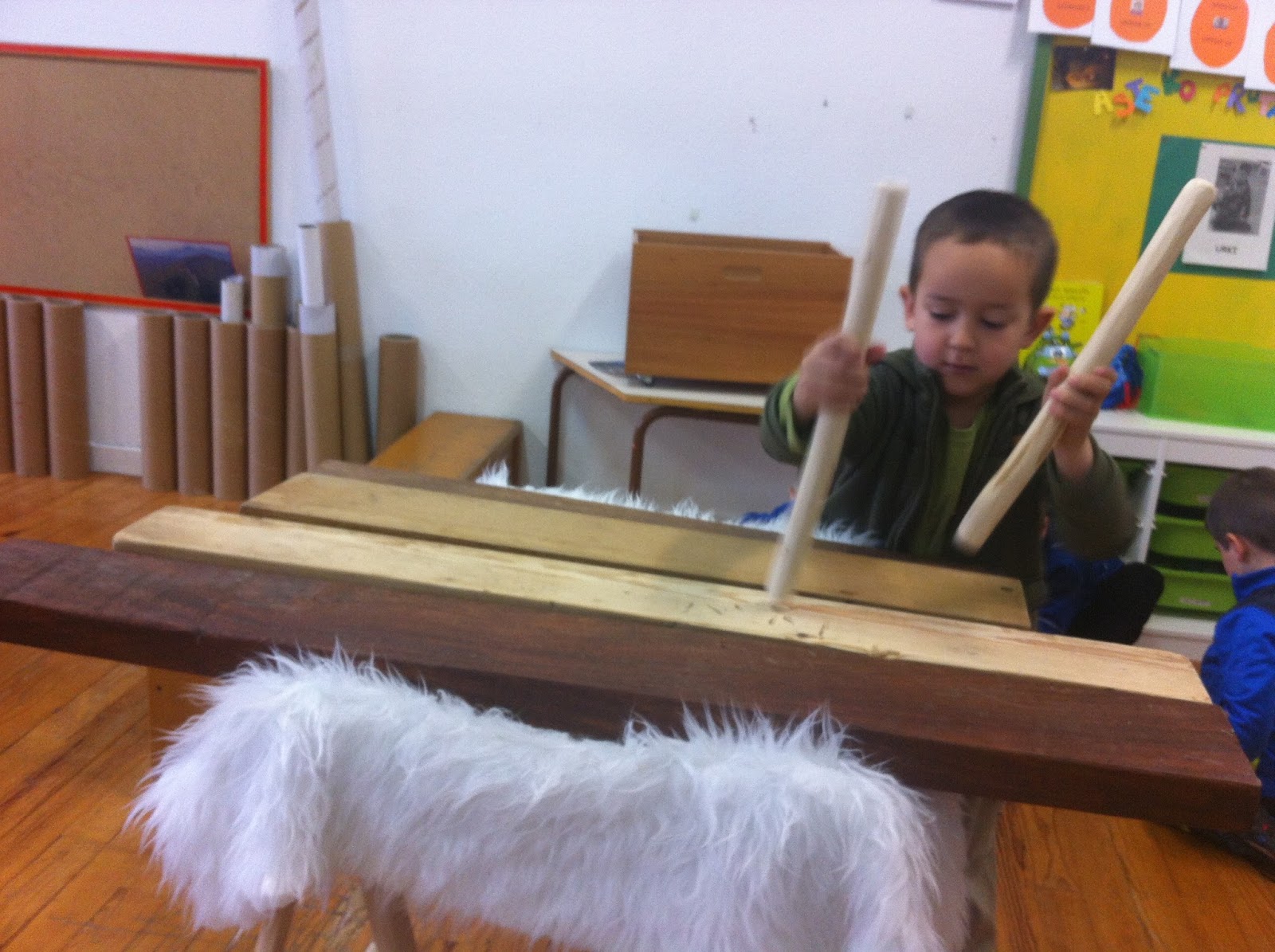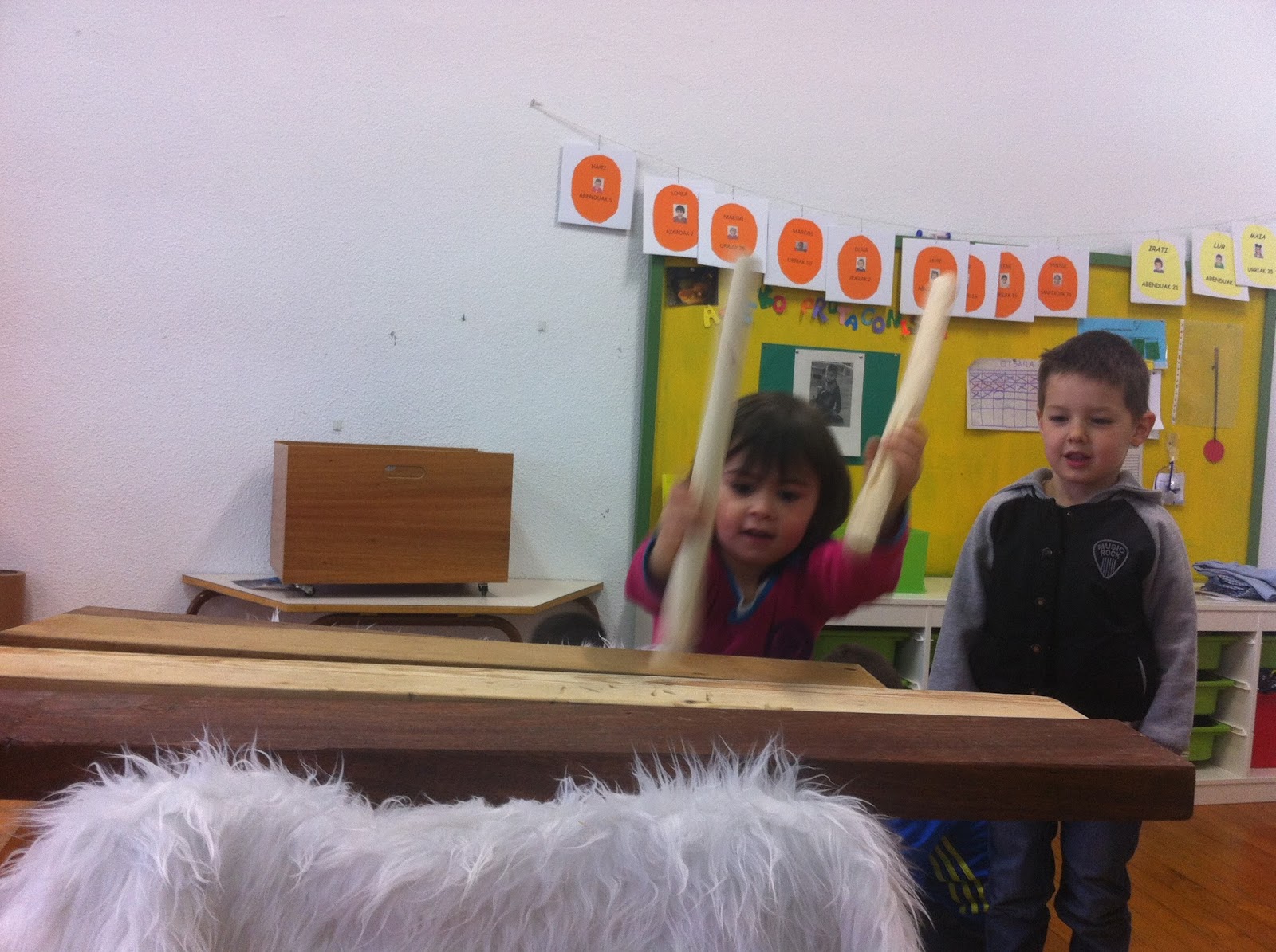Oporretatik bueltan aitak lagundurik etorri zen Urki eskolara. Jolas bete kutxa zekarten eskutan baita egur xaflak eta ardi larrua ere. Ba al dakizue zer zen? Musika tresna bat zen, txalaparta hain juxtu. Egunotan atsegin haundiz entzun ditugu haren doinuak.