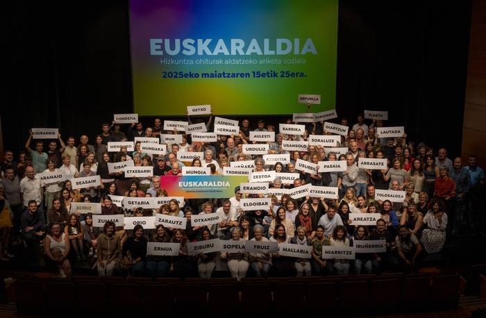Euskal Herri osotik etorritako berrehun lagunetik gora Euskaraldia ON! Topaketan parte hartu zuten Eibarreko Coliseo antzokian atzo. Antolaketan ibili diren edo ibiliko diren boluntario, teknikari eta eragileak ziren, guztiek ere Euskaraldiaren laugarren edizioa begiz jota dutena, 2025eko maiatzaren 15etik 25era egingo dena. Irati Iciar, Euskaltzaleen Topaguneko lehendakariak esan zuenez, "konbentzituta nago, handia dela herriz herri elkarrekin egitera goazena". Horrekin batera, Euskaraldia ariketa bera jendea aktibatzeko eta saretzeko "tresna ezin hobea" izan daitekeela gaineratu zuen: "ahalik eta komunitate zabalena jarri nahi dugu dantzan, euskararen alde". Topagunekoak argi dute: "herrietako mugimendurik gabe ez da Euskaraldirik posible izango". Atzoko topaketarekin Euskaraldiko laugarren edizioaren lehen pausoa irudikatu nahi izan zuten.