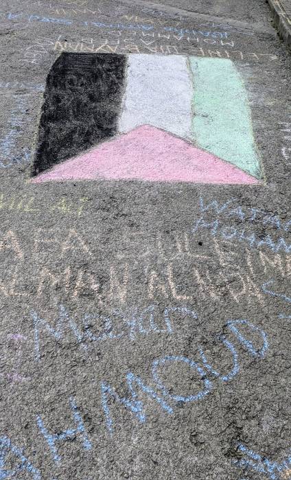 Euskal Herriko makina bat herritan Lurra. Justizia. Bakea lelopean elkarretaratzeak egin zituzten atzo. Etxarri Aranatzen plazan bilkura egin zuten. Bakaikun, berriz, bilkura baliatu zuten errepidean Israelek hildako ume palestinarren izenak idazteko. Gernika Palestina herri ekimenak egin du deialdia, eta Palestinako herria sufritzen ari den genozidioa salatu nahi izan zuten bilkura horiekin.