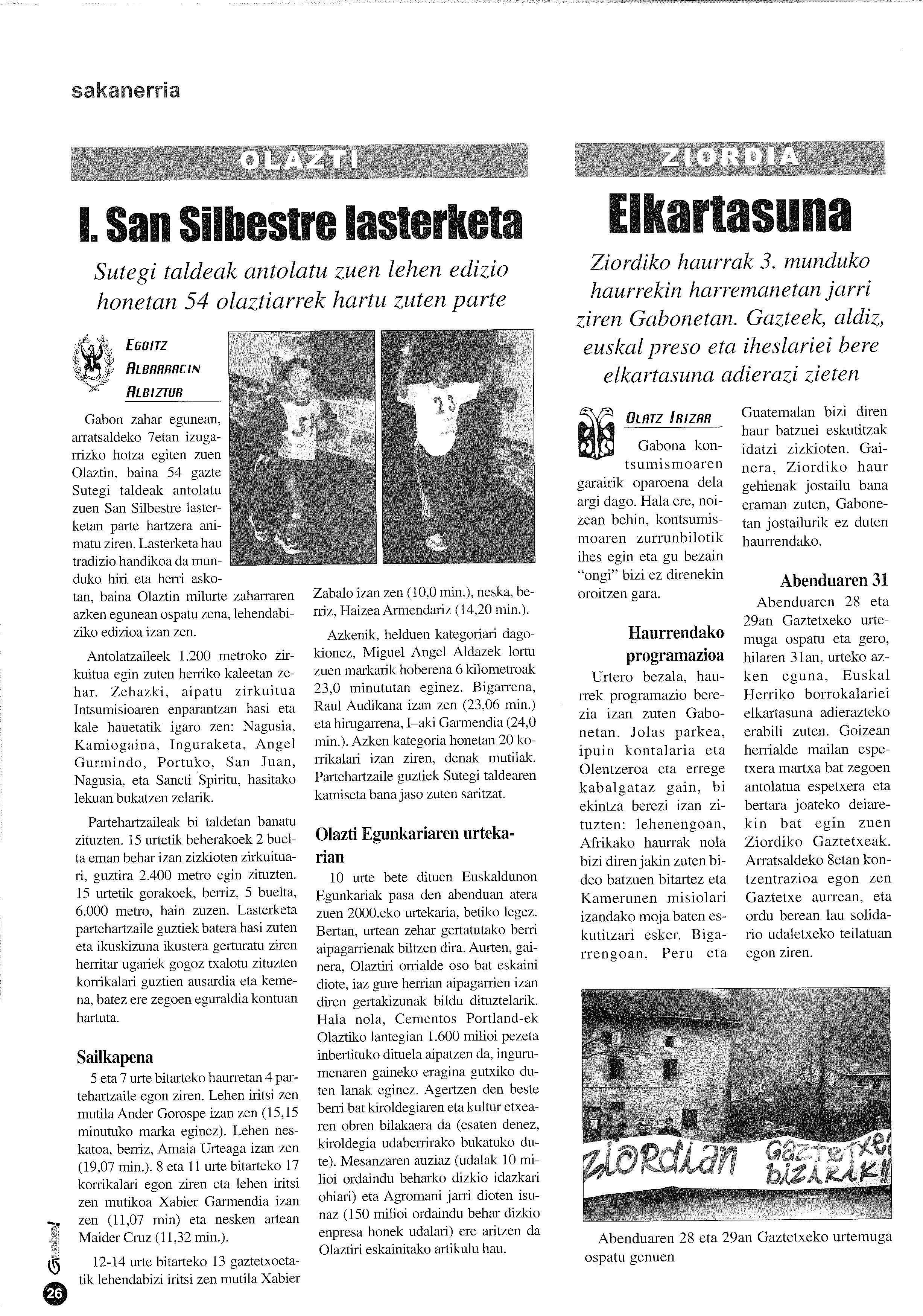 Sutegi taldeak estreinakoz San Silbestre lasterketa antolatu zuen. 54 gaztek eman zuten izena. 15 urtetik beherakoek herrian barnako 1.200 metroko zirkuituari bi buelta eman behar zizkioten (2.400 metro) eta 15 urtetik gorakoek bost (6.000 metro). Helduen mailan ez zen emakumezkorik aurkeztu eta podiuma honakoek osatu zuten: Migel Angel Aldaz, Raul Audikana eta Iñaki Garmendia. Haurren mailak, adinaren araberako hiru sailkapen izan ziren.