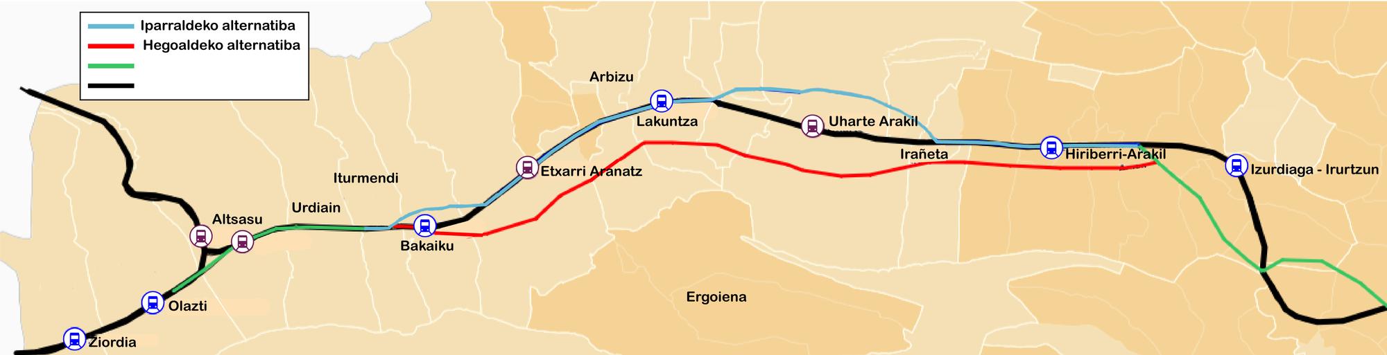 Bakaikura bitartean bi ibilbide posible zirriborratu dituzte. Iparraldekoa da Ministerioak hobesten duena. Aukera horrek 20 km-ko luzera du. Irañetako lehen etxeetara iritsi aurretik trazadurak iparraldera eginen luke, Aralarrerantz. Herrigunetik 50 eta 300 metro arteko distantziara legoke. 2+1 plataforma izaten segituko luke. Uharten trenbide saihesbide moduko bat eginen lukete eta Zamartze inguruan geltoki berria eraikiko litzateke. Amurgingo bidearen azpitik Arruazu eta Lakuntzarantz eginen luke. Lakuntzako industrialdearen parean egungo trenbide trazatuarekin bat eginen luke.