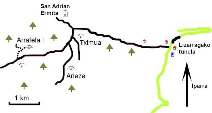 Arrafelako lezea. Lizarragako portutik mendebaldera doan bidea, Arangarte, hartu eta Olleiku eztarrian, aurrera egin beharrean hegoaldera egin, baina berehala mendebaldera egin behar da, Ollozuiko zierreko bidea hartuz, Obats edo Lubierrira jotzeko. 2,5 km-ra, bidearen iparraldean dago lezea, basoaren erdian. Lezearen ahoak 16 metro luze eta 6 metro zabal ditu eta 43 metroko sakonera. Lezean areto handi bat dago. Eskuin aldean hiru laku eta formazio ugari daude. Aretoa bitan banatu dute goitik eroritako materialek. Aurreneko hara 80ko hamarkadan jaitsi ziren. Orduan ere ikusi zuten aparteko ondarea izan zezakeela.