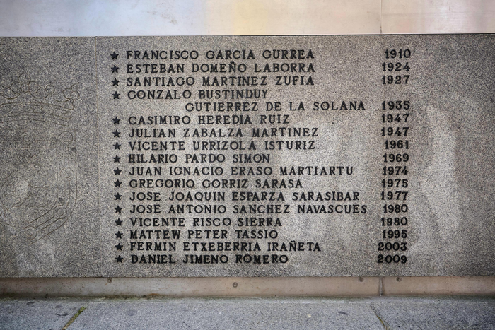 Oroitzapenezko idazkunen mustutze ekitaldia garagarrilaren 26an egin zuen Iruñeko Udalak. 2023ko abenduan udalak entzierroan hil direnen izenen plakak jarri zituen entzierroaren ibilbideko galtzada-harrietan, baina irristatzeko arriskua zegoenez, kendu zituzten. Horren ordez, Iruñeko Udalak Entzierroaren monumentua hautatu du hildako 16 gizonezkoak oroitarazteko. Idazkunak granitozko idulkiaren gainean jarri dituzte, monumentuaren alde batean, hiriko armarriaren ondoan; hala, eskulturak protagonismoa izaten jarraituko du, eta espazio bakar batean sanferminetako ohiko irudi bat eta hiriko eredu den lasterketa horretan hil direnen oroitzapena bateratzen dira.