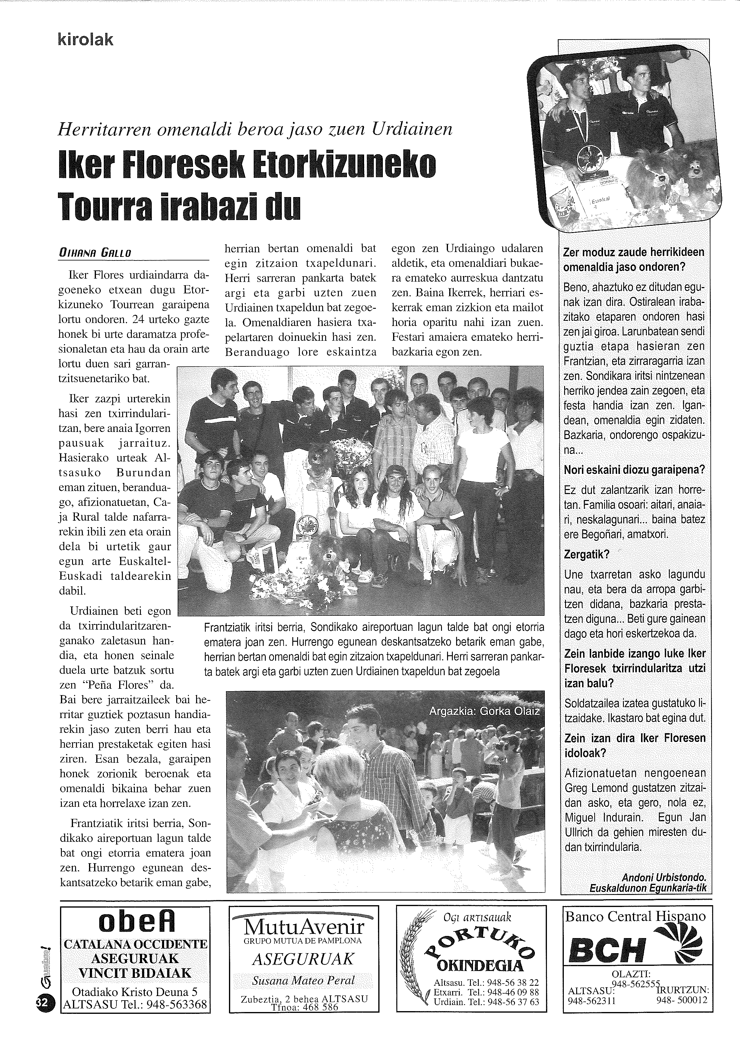 Iker Floresek irabazi zuen Etorkizuneko Tourra. Bi urte zeramatzan txirrindulari urdindarrak profesionaletan Euskaltel-Euskadiren mailota defendatzen. Floresek azken aurreko etapa, 9.a, irabazi eta lider jarri zen. Azken etapan liderraren mailotari eutsi eta lasterketako irabazlea izan zen. Urdindarrek Sondikako (Loiu egun) aireportuan harrera egin zioten eta hurrengo egunean bertan Urdiainek herriko txapelduna omendu zuen.