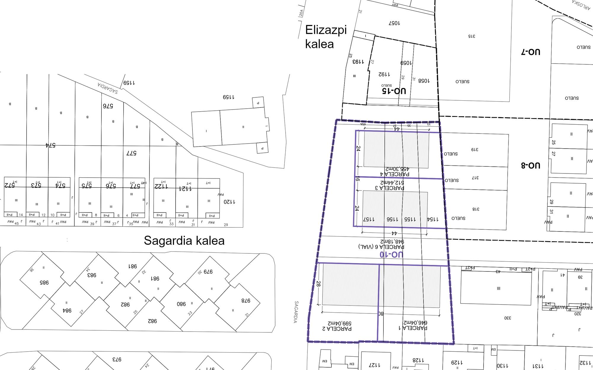 Sortu diren lau partzela berrietatik sustatzaile bakoitzak biren jabetza du. Lehen partzelan (646,04 m2) beheko solairua eta bi gehiago dituzten lau etxebizitza eraiki daitezke. Bigarren partzelan (599,04 m2) aurrekoen antzeko hiru etxebizitza eraiki daitezke. Hirugarrenean (512,44 m2) beste hiru etxebizitza jaso daitezke, aurrekoen tipologia bera dutenak. Azkenik, laugarren partzelan (455,30 m2) hiru etxebizitza eraikitzeko aukera izanen da. Horiek ere behe solairua eta bi altuera izanen dituzte. Unitateko 948 metro eta 18 decímetro karratu udalaren eskura pasako diren kaleak izanen dira.